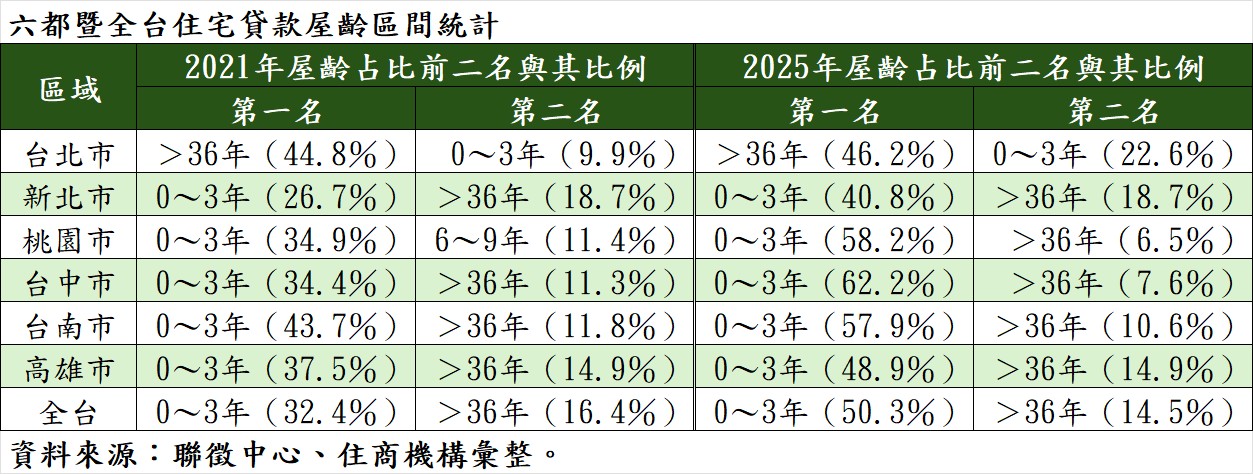 不過,觀察六都,台北市是唯一以屋齡大於36年老屋穩居貸款主力的城市,2025年占比達46.2%。大家房屋企劃研究室公關襄理賴志昶指出,近年全台適逢完工交屋潮,同時購屋主力較青睞新屋,進而推升新案申貸比例。