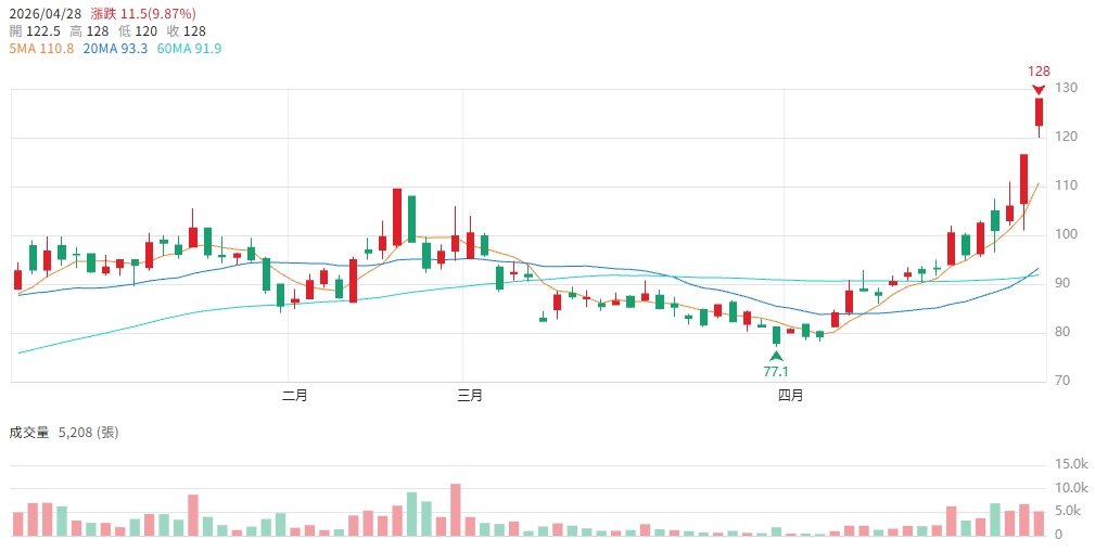 籌碼面上,4月27日外資與投信同步站在買方,三大法人單日合計買超1,019 張,顯示內外資法人認同其轉型轉機題材。雖然盤中128元已進入高檔加速區,且短線與月線乖離率偏高,但只要3月營收的強勁動能延續,高估值有望隨獲利成長而逐步消化。