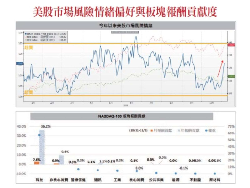 十月底以來市場對Fed達升息循環終點的信心提升,使得美債殖利率快速回落,投資人風險情緒好轉,推升美股主要指數走揚,扭轉先前疲弱態勢,股債雙漲的樂觀情緒帶動下,美股以科技通訊及非必須消費板塊表現較為強勁。