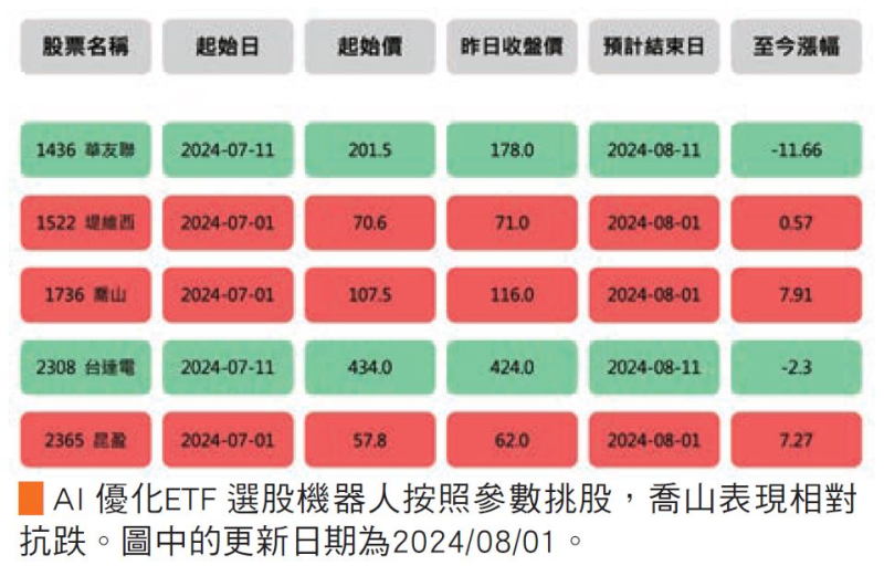 最近大盤面臨下修,7/11~8/2已經下修9.2個百分點,至目前AI機器人選股的優化ETF投資組合績效為正的4.56,顯示面臨市場急遽變動時,機器人選股的標的可避免嚴重的跌幅。