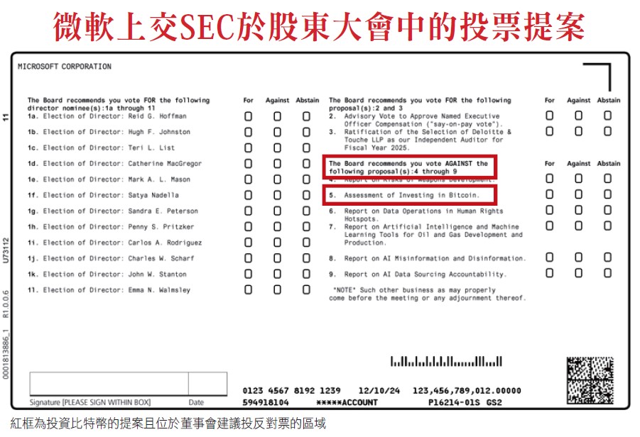 全球公司市值排名數一數二的美國龍頭科技股-Microsoft(MSFT)微軟,在一份提交給美國證券交易委員會(SEC)的文件顯示,2024年12月10日的微軟股東大會上,將對「比特幣投資評估」進行投票,而此提案是由保守派智庫國家公共政策研究中心(NCPPR)提出。