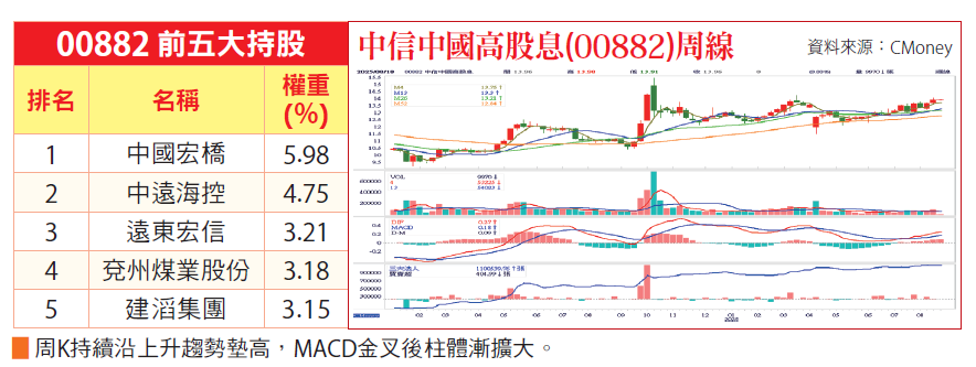 例:00882中信中國高股息(港股中資高股息龍頭,通常半年配息),或以中國大型國企、金融、能源、電信為主的指數型產品。
