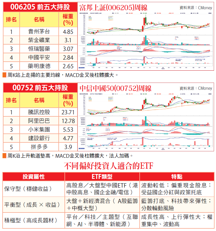 例:006205富邦上證(上證180)(A股藍籌,貼近內需與製造鏈)搭配00752中信中國50(濃縮中概大型股,含平台與金融消費龍頭),或一檔「全中國」寬基ETF(如MSCI/FTSE中國)。