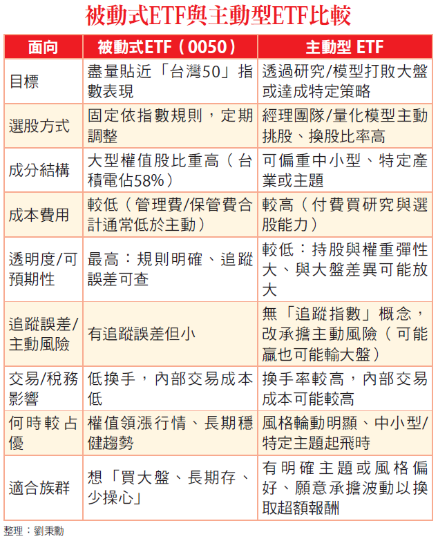 被動式ETF(如0050)照既定指數規則買進、定期調整,費用低、分散度高、透明度強,長期「跟著市場走」。優點是省心與成本優勢;缺點是難以跑贏大盤,遇到「權值休息、題材股活躍」時,漲幅可能落後。
