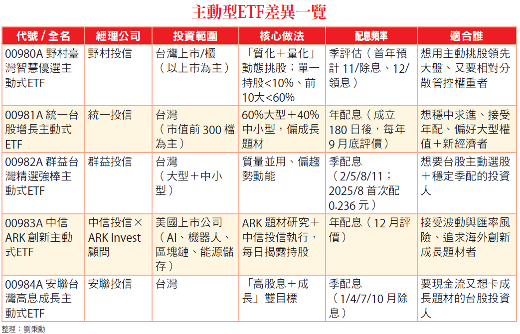 主動型ETF(如00980A/00981A/00982A/00983A/00984A)由經理團隊與模型主動挑股與調整權重,常聚焦「動能、成長或高股息」等策略。好處是能更快跟上輪動與趨勢;風險是費用較高、波動較大、配息非保證,績效高度仰賴團隊執行力,且許多新檔成立時間短,缺乏長期驗證。