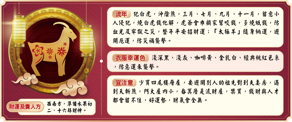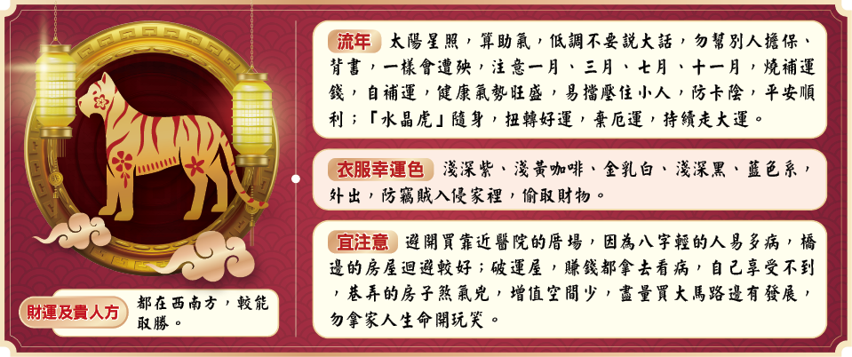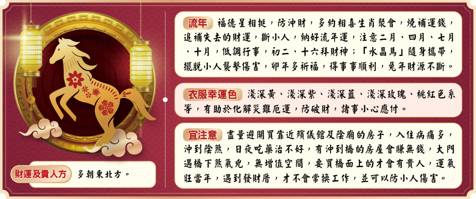 而兔年鴻運當頭的有三生肖,分別是虎、馬及猴,張旭初說,屬虎者在去年犯太歲,而今年謝太歲後,就擺脫太歲星君對運勢的阻撓,並有吉星紫微星君來照拂,運勢將遙遙領先,有機會賺到大錢。