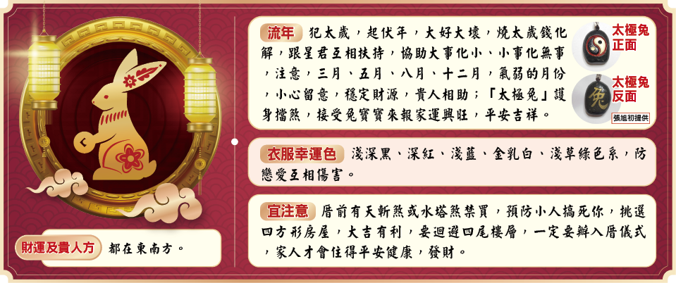 去年壬寅虎年,國際紛爭及疫情打壞行情,新的癸卯兔年,只要財運佈局好及接財神,財神爺看到誠心,可望將去年發不出去的財運,一一都補到兔年來。