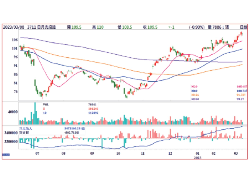 日月光股價從110年133元高點一路走低,最低跌到71.4元,去年十月開始就穩定回升近期達111元,漲幅達55%,但以EPS 14.5元計算本益比只有七倍還是低估,仍具投資價值。目前股價已經站上所有均線形成完全的多頭排列,近期法人提高目標價至118元。