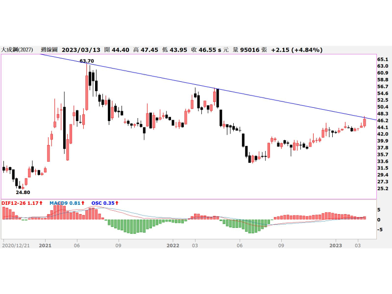 大成鋼是美國鋁捲板及不鏽鋼最大通路商,下半年德州鋁捲板廠產能開出後,市占率將進一步提升,今年美國經濟雜音較多,不鏽鋼與鋁價難回到2022年高檔,預期今年獲利將從2022年EPS 6.23元下滑到2.7~3元,2024年EPS估4.5元,2022年現金股利2.4元,股票股利2元,3/14殖利率為10%。