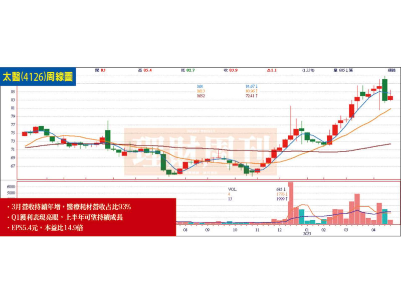 生技股太醫(4126)首季營收與毛利率均有年增,自結營業利益高達150%,大幅優於市場預期,旗下產品密閉式抽痰管拉貨激增,且新興市場開發逐步見到效益,估全年每股盈餘有機會站上5.4元,以18倍本益比計,股價上看98元。