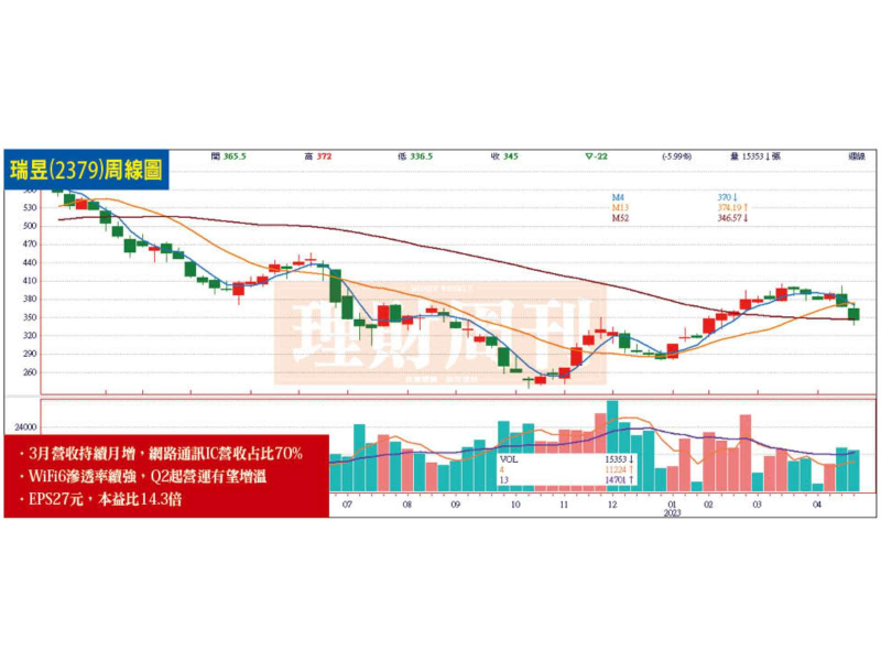 理周投研部指出,瑞昱股價自今年年初從280元一路漲至390元後,市場即傳出受庫存影響,加上對第二季產業不明朗,買盤縮手,股價因此受到壓抑。但在該公司公布季報,市場呈現正反兩極看法,反映在盤面即有比較大震盪,個股走勢值得留意。