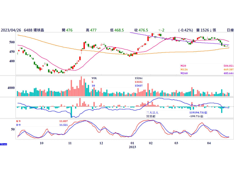 環球晶股價一度漲到906元,合併德國世創破局一度跌到331元,今年二月回升至547元,近期震盪走低回測468元已領先大盤回跌三個月,目前半年線支撐465元有機會形成底部,日線(KD指標)也回到嚴重超賣區(8,11),有機會再發動一波新的行情。