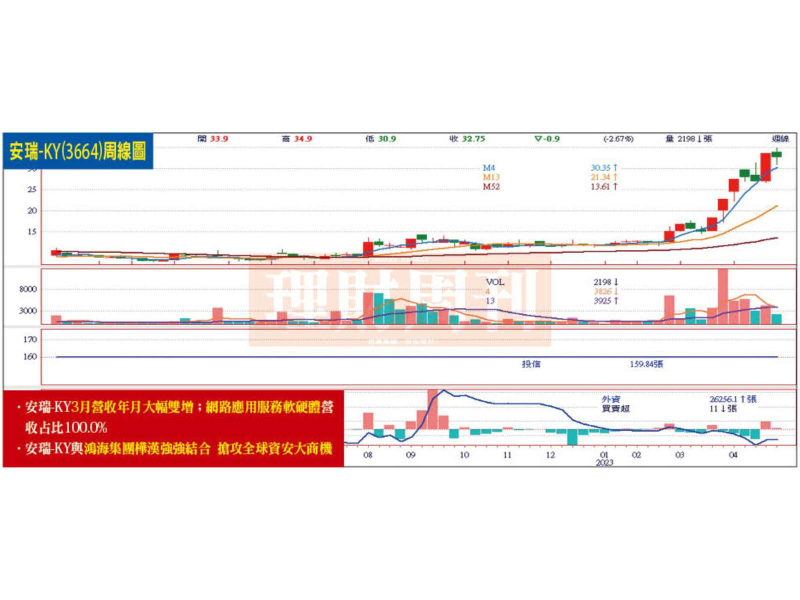 網路應用服務軟硬體(營收占比100.00%)專業廠安瑞-KY(3664),公布三月合併營收為0.52億元,月增率多達137.64%,年增率亦達83.80%;今年一到三月累計合併營收達0.97億元,年增率為44.53%。
