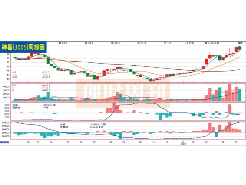 神基公佈首季累計合併營收為81.55億元,較去年同期的75.57億元成長7.91%,5月9日再公佈四月營收27.66億元,動能較三月走緩,月減8.1%。事實上,神基股價在四月站上61.5元後,市場即出現多空看法分歧走勢,尤其9日公佈四月營收時,開盤即突破法人估的62元高點,但隨即被摜壓至60元尋求支撐。