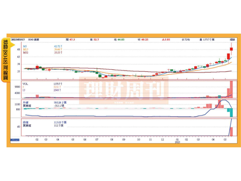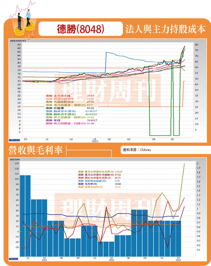 台灣光纖網路設備(營收占比93.72%)專業廠德勝(8048),公布四月份營收為1.77億元,強勢創下歷史新高紀錄,月增率47.82%,亦已連續三個月為月增狀態,年增率則高達129.68%,不僅創下年增幅度歷史新高,更已連續多達十五個月為年增狀態,累計今年一至四月總營收為4.91億元,年增率64.71%。