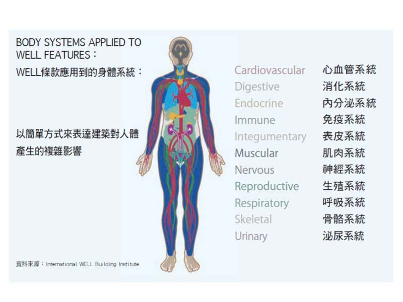 依照WELL健康建築標準可改善人體十一大身體系統,包含人體心血管、消化系統、內分泌系統、免疫系統、皮膚系統、肌肉系統、神經系統、生殖系統、呼吸系統、骨骼系統、泌尿系統等,建立人體與建築環境之間的聯繫,總結歸納出七大類標準。例如:2020年新冠肺炎(COVID-19)疫情使全球開始注重增強自身免疫系統,可從環境中的水、空氣及健身來做改善。除了建築本身設置硬體設備規劃「防疫宅」外,還可從WELL的七大身心健康面向做全方位考量居家防疫。