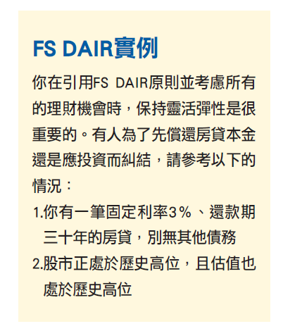 你在計算數字時會發現,如果你的利率高於10%,FS DAIR建議你把100%的現金流(扣除生活開支)拿去還債。