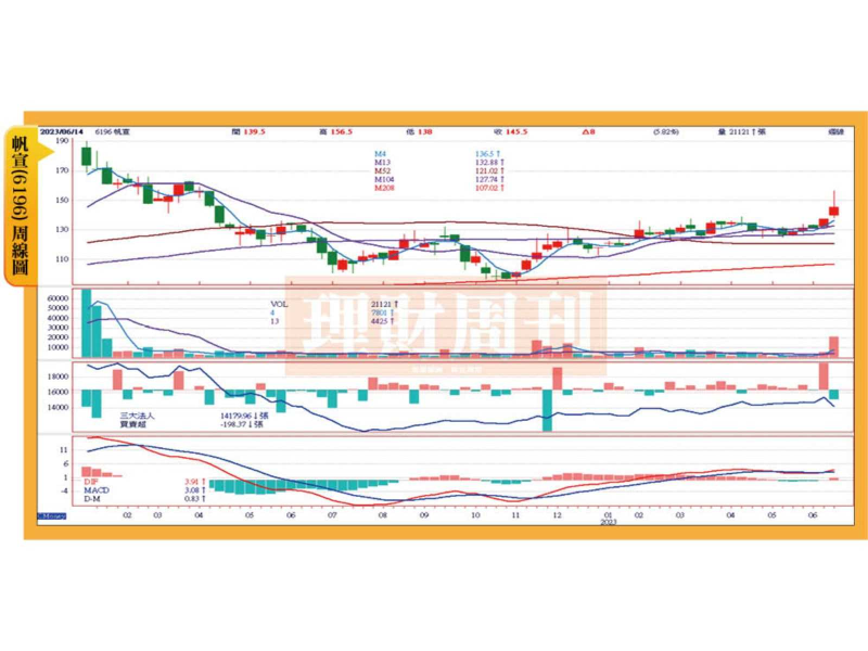 理周投研部指出,帆宣股價在四月進行130元下的W盤整格局,5月26日一舉站上130元突破各均線後就不回頭了,攻漲即量增,整理即量縮,6月12日爆出五千餘張大量漲停鎖住至收盤,該股七月才進行除息,近日股價已漲高,若欲賺除息價差者,觀察若有回測137元則可大舉買進。