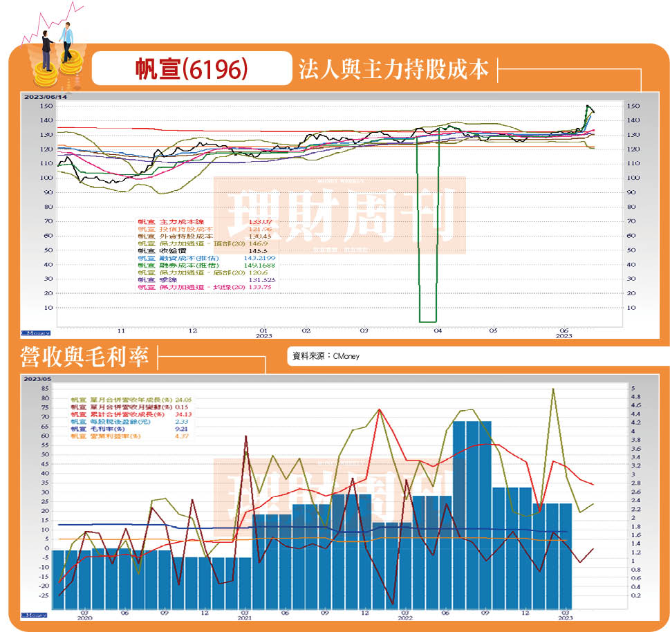 帆宣為上市其他電子類股,目前類股本益比約在14倍,且日前輝達(NVIDIA)AI旋風推升台股直攻萬六時,個股並無受到市場多頭太多著墨,反而在AI概念族群漲勢接近尾聲時,6月12日開盤直攻151元漲停做收,顯然是概念股中落後補漲者,當然也有人認為進入除息旺周,是反映除息行情。