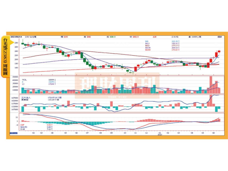 台光電6/13截稿前收盤價239元,2022年EPS 15.24元、本益比15倍,預估今年發放現金股利8.5元,殖利率3.5%。美系外資預估今年EPS可達19.38元,調升目標價到234元。技術線圖日線來看,5/15收盤價174元突破前高之後,股價一路上揚,周線亦呈「一星二陽」的多頭格局,可多留意。