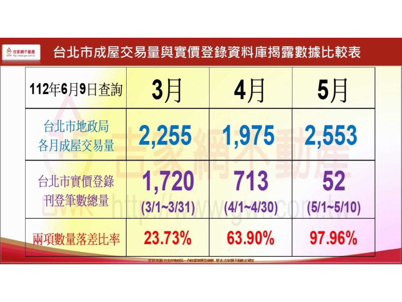 (一)交易量統計的盲點~官方實價登錄不即時,落後巿場成交數據達兩個月以上的落差:地政機關的交易量統計與公布以登記過戶為基準,一般房市交易簽約到過戶會有落差時間,而過戶登錄到官方實價登錄又有官方過濾延遲落差,因此,實價登錄的單月交易量與市場實際交易量會有很大落差。雖然交易過戶與實際簽約成交量有落差約一個月的過戶遞延時間,但因過戶時間不變,所以內政部月底結算的數量不會再變動,而實價登錄的交易量是隔兩個月陸續填補上去,因此才會有全國二樓以上住宅成交量僅410戶的畸形數字,台北市才17戶,但統計者必須要有專業判斷,才不至於做錯誤的分析。