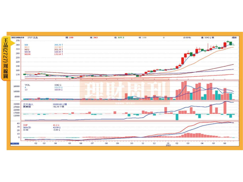理周投研部表示,王品股價從今年二月190元開始起漲,最高來到6月7日的371元,但最近呈現量縮回測走勢,KD線也下彎至20至50非超買區,若以19日341元做收,等於壓回幅度達8%,投資人逢低買進符合本期挑股原則,估該公司全年每股稅後獲利可達16元,以25倍本益比計,中長線股價有機會挑戰400元。