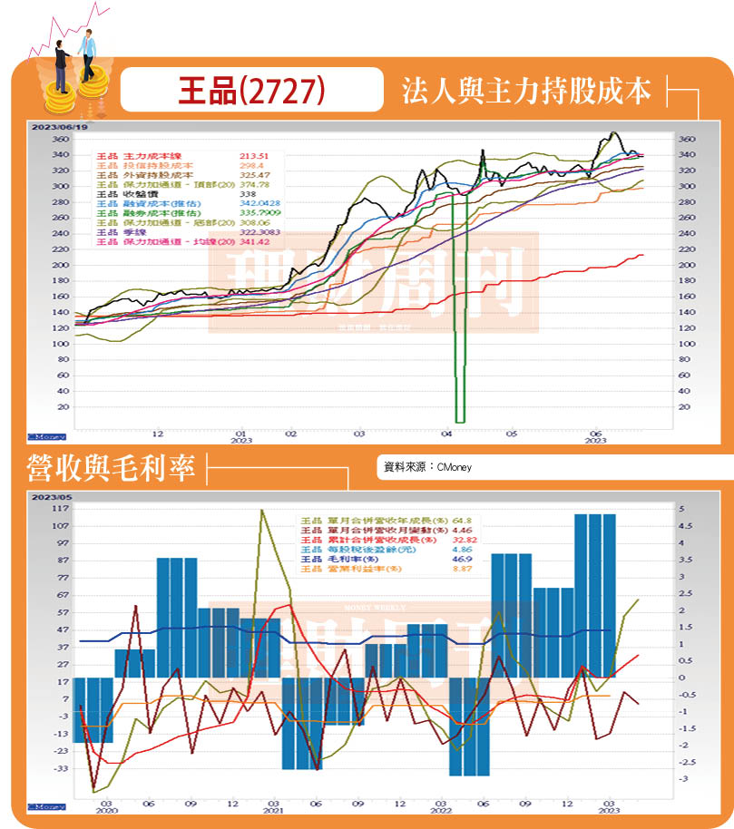 受惠兩岸相繼解封,餐飲龍頭王品(2727)業績表現大幅成長,股價自今年二月從190元開始起漲,一路盤堅走高,股價最高來到371元,目前剛好壓回五日線上約8%,馬上進入端午連假以及暑假旺季,營收將呈現逐月走高態勢,法人估全年每股稅後獲利16元,股價中長線有機會挑戰400元,短線因端午連假,六月營收可望再創高,按股性分析會有一波漲勢。