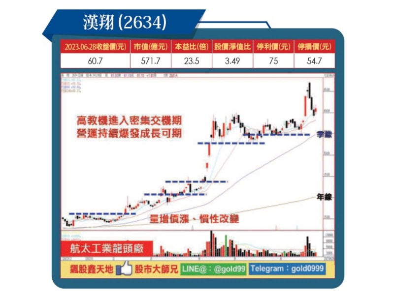 (1)營運表現亮眼,獲利倍增可期:漢翔2022年營收302.42億元,年增27%,稅後純益16.27億元,EPS 1.73元,較2021年0.59元獲利倍增成長,受惠軍用及商用接單同步發酵,研製軍用「勇鷹號」高教機今年將放量交機,推升累計前四月營收年增65.01%,續創歷年同期新高,首季每股盈餘0.58元,季增114.5%,年增163.6%,優於預期。