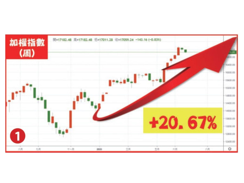 外資今年以來至6/26止買超4,092億、投信買超729億、自營商買超655億,三大法人合計買超5,476億,顯見法人看法一致,且買盤子彈源源不絕,而大盤月成交量自一月2.32兆元、二月3.84兆元、三月5.09兆元、四月3.71兆元、五月更達5.38兆元,成交量呈現大幅增加現象,同時五月證券劃撥存款餘額達3.26兆元,月增744億元,再創近一年新高,顯示資金狂潮即將到來!另加權指數今年以來至6/26收17059點上漲2,922點,漲幅達20.67%(詳圖一)。