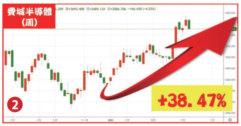 美國四大指數道瓊今年以來至6/23收33727點上漲580點漲幅1.75%,NASDAQ今年以來至6/23收13492點上漲3026漲幅達28.91%,S&P500今年以來至6/23收4348點上漲509點漲幅13.26%,費城半導體今年以來至6/23收3506點上漲947點漲幅達38.47%(詳圖二),跟台股連動最深的就是科技類股,即NASDAQ及費城半導體,在美國聯準會(Fed)六月初暫停升息之下,科技股賣壓減緩,引爆了一波急漲行情,台股同步受益大漲。