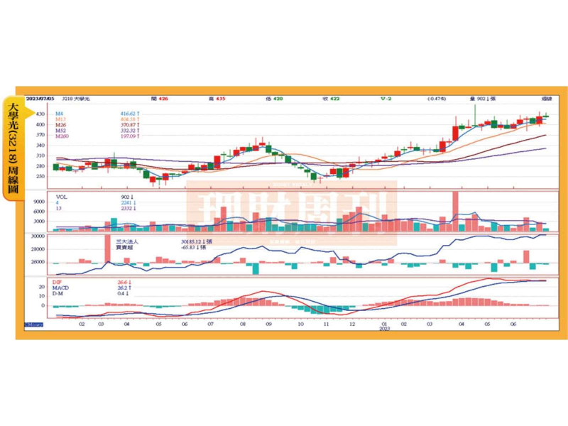 大學光兩大產品線,一是光學產品,另一是醫學的屈光鐳射與白內障手術會是業績成長兩動能,尤其進入七、八月暑假,學生族群會趁此時矯正視力,挹注營收表現會逐月增長,再加上七月底生技醫療大展,題材性加持可望吸引多頭資金青睞。
