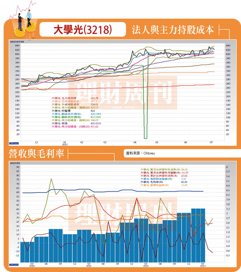 大學光(3218)屬於生技通路並兼有屈光鐳射技術眼科診所,兩岸均有布點,隨著疫情解封,台灣營收表現亮眼,但中國大陸則表現平緩,首季財報每股稅後淨利年增25%,創單季新高。大學光預計今年中國大陸與台灣將再增設2家新據點,且台灣也有五家營業點將進行翻新,兩岸雙引擎齊發,營收可望逐月提升,尤其暑假為學生族群矯正眼睛的消費旺季,七、八月營收再創高。法人估全年每股獲利達13.71元,明年挑戰17.88元,中長線目標價上看470元。