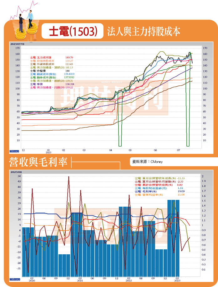 截至去(2022)年底,士電(1503)合併營業額307.58億元,成長11.08%,合併稅前利益為27.6億元,成長11.41%。目前綠能是主要成長動能,預計兩年內相關業績將由目前的兩成提升至四成。士電六月營收24.53億元,月減2.33%,年減15.55%,第一季合併營收達89.72億元,EPS從去年同期1.38元增至1.52元,改寫同期新高與單季史上新高。