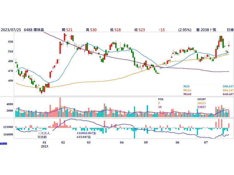 環球晶股價在今年2月2日一度漲到547元,之後震盪走低5月12日跌到463元,近兩個月除息前股價一度回到542元,今年都維持在547~463元僅18%區間震盪,落後加權指數及其他個股漲幅甚多,以7月25日收盤價523元計本益比十一倍,具長線投資價值。