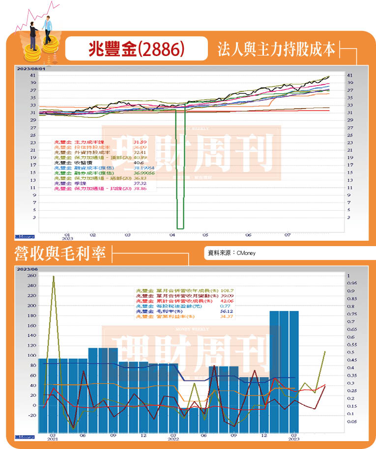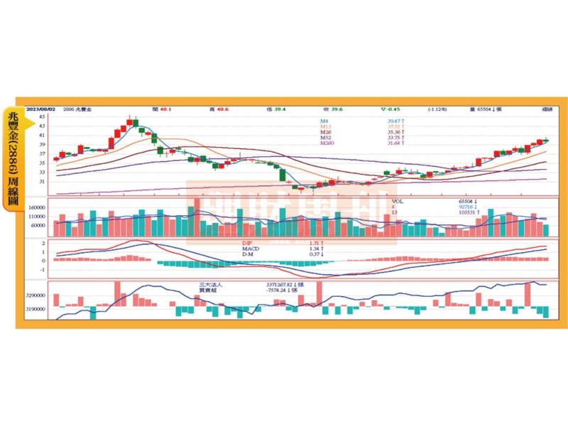 兆豐金今年第一季即因一至四月換匯交易每月貢獻10億元淨收入,使首季獲利年增高達70%,六月因國際再保公司防疫理賠支付進度緩慢,產險子公司仍虧損11.76億元,但在銀行獲利激增挹注下,仍賺23.76億元,年增13.4%;累計今年前六月稅後獲利187.67億,年增135.88%,累計每股稅後盈餘1.35元,顯示旗下業績都已呈現轉強趨勢,股價從5月15日36元起漲,量價穩定底底高,一路攻上40.6元,守在五日均線上。