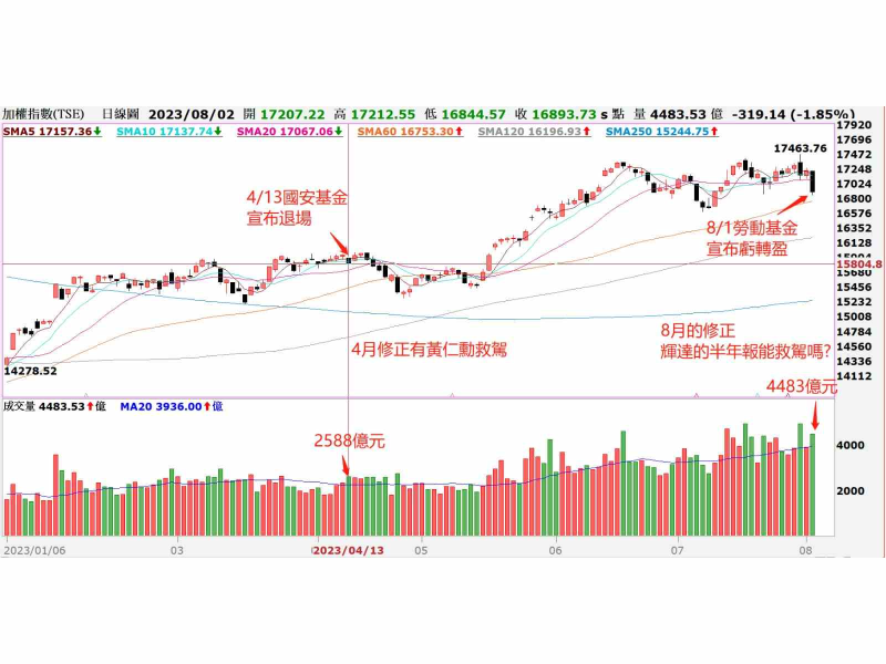 不過,勞動基金公布虧轉盈的好消息,加權指數也出現拉回,正好是第二季財報公布期間,筆者接近收盤時才想起前一次,國安基金在4月13日宣布護盤機制退場後,加權指數從15963高點跌到15284低點,那次正好是第一季財報公布尾聲。
