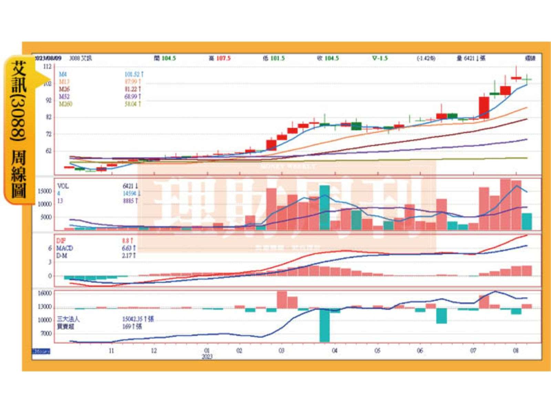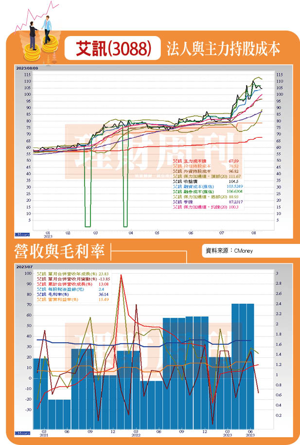受惠疫後復甦,歐美買氣增溫及缺料緩解,艾訊2022年營收66.1億元,年增30.56%,EPS 6.66元,寫下歷史新高,訂單熱絡持續到2023年,第一季營收15.7億元,季增17.3%、年增16%;第二季營收18.5億元,季增17.33%,年增16%,上半年稅後淨利3.4億元、EPS 3.75元。