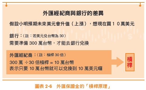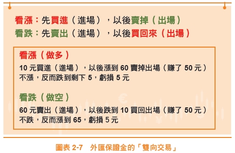 外匯交易可以運用「交易槓桿」進行比本金幾倍大的交易,這種稱作「外匯保證金」。比如,存入一萬元的本金,原本只能進行一萬元額度的交易。但是若以三十倍槓桿交易時,一萬元本金則可進行三十萬元額度的交易。像這樣以小額資金進行好幾倍額度的交易,這種機制稱作「交易槓桿」(見圖表2-6)。而且,外匯是二十四小時不間斷的雙向交易,不論市場漲跌都可以交易,「做多」、「做空」都可以(見圖表2-7)。