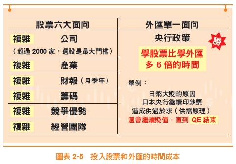 另外,股票「跌停板」的設計,對散戶是極為不利的。我曾經買過一檔股票,從二十四元一下子十一根跌停鎖死,要賣都賣不掉,這是十分不公平的遊戲規則。相反地,外匯就沒有漲跌停的限制。外匯交易的是貨幣,貨幣是一個國家的實力,做外匯不用分析公司,只要分析全球政治經濟。可以這麼說,看懂各國央行政策,就懂得怎麼操作外匯(見圖表2-5)。