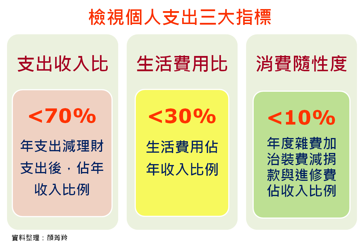 整理自身的消費支出,找出漏財的地方及優化的方向,這也是做好預算編列的重要依據,透過數據分析來看看自己是否有支出方面的「三高」,是哪三高呢?分別是:一、支出收入比:不超過70%,也就是每100元的收入,以不花超過70元為原則,這樣一來儲蓄率可以有30%。二、生活費用比:不超過30%,每100元的收入,在衣食住行基本生活費支出不超過30元為原則。三、消費隨性度:每年的旅遊、娛樂、交際應酬等以不超過年收入的10%為原則。
