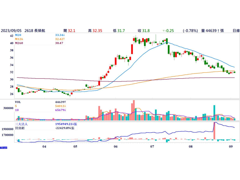 長榮航今年股價一度在七月份創歷史新高42.4元,近兩個月出現回檔跌到31.3元,6/19~9/5外資累計賣超台股3050億反而大買長榮航,可見外資作多企圖心強烈。目前半年線在32元及年線在30.5元將會成為底部。八月營收估計會再連續第三個月創歷史新高,尤其高票價可能會維持到2025年都不會改變。