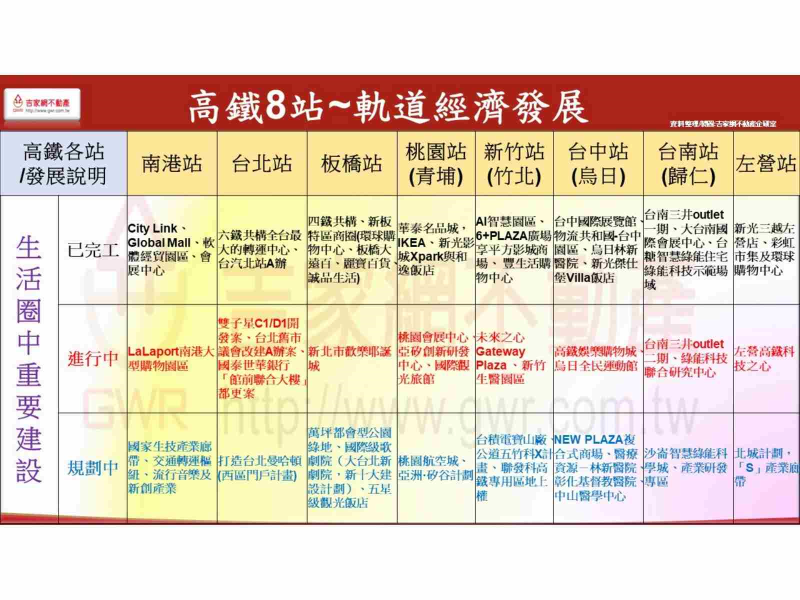 (六)高鐵軌道經濟、重劃區、新興工業區,三大引擎帶動房市榮景:未來全台房市推動,將由高鐵軌道經濟串連各都會新興重劃區與產業工業園區,成為房市長線發展的三大引擎。高鐵通車多年,但高鐵各站位置大都距離都會中心較遠,缺乏生活機能帶動,以致投資吸引力不足而影響招商進度。近年來高鐵帶動全台一日生活圈,大型商場紛紛進駐高鐵站特區,建商信心增強且勇於推案,因房價基期低,因此漲勢凌厲,如台南歸仁高鐵與桃園青埔高鐵,都在OUTLET進駐帶動下,商圈逐漸成熟,生活機能也逐漸增強,往後台中烏日的SOGO娛樂城、高雄左營的北城計劃、南港台壽的LaLaPort,都將複製台南歸仁與桃園青埔的成功經驗,創造新興商圈,並透過交通建設串連新興重劃區與工業區產業園區,成為都會房市推展的三大引擎。