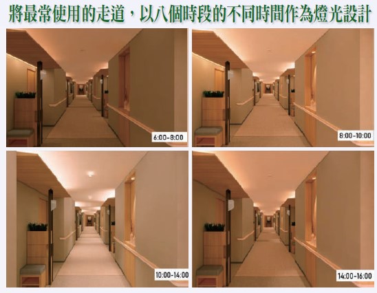 本案設計特別將最常使用的走道,以八個時段的不同時間作為燈光設計。