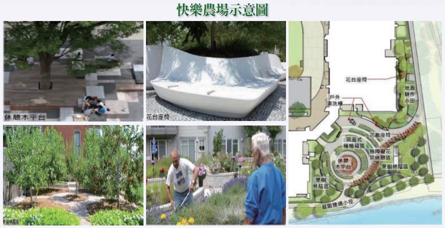快樂農場分為兩區,在廣闊的基地中可縮短使用的距離。一區為A棟使用,外側種植喬木減緩外部季風,內側搭配景觀座椅,供長者可做隨時的停等與休憩,使植栽活動除了動手做外,還可以在庭園中彼此分享作物心得。
