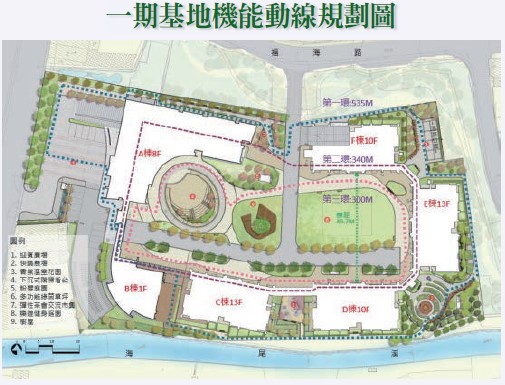 一期基地人行動線分為三環三線計畫,長者可在基地運動散步,享受多元的動線景觀: