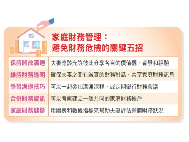確保夫妻之間有誠實的財務對話,共享家庭財務訊息。如果一方有不良的財務習慣,應該一起努力改進,並設立共同的財務目標。