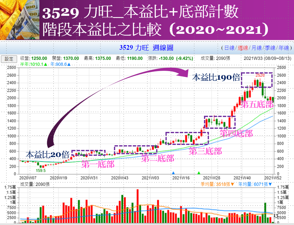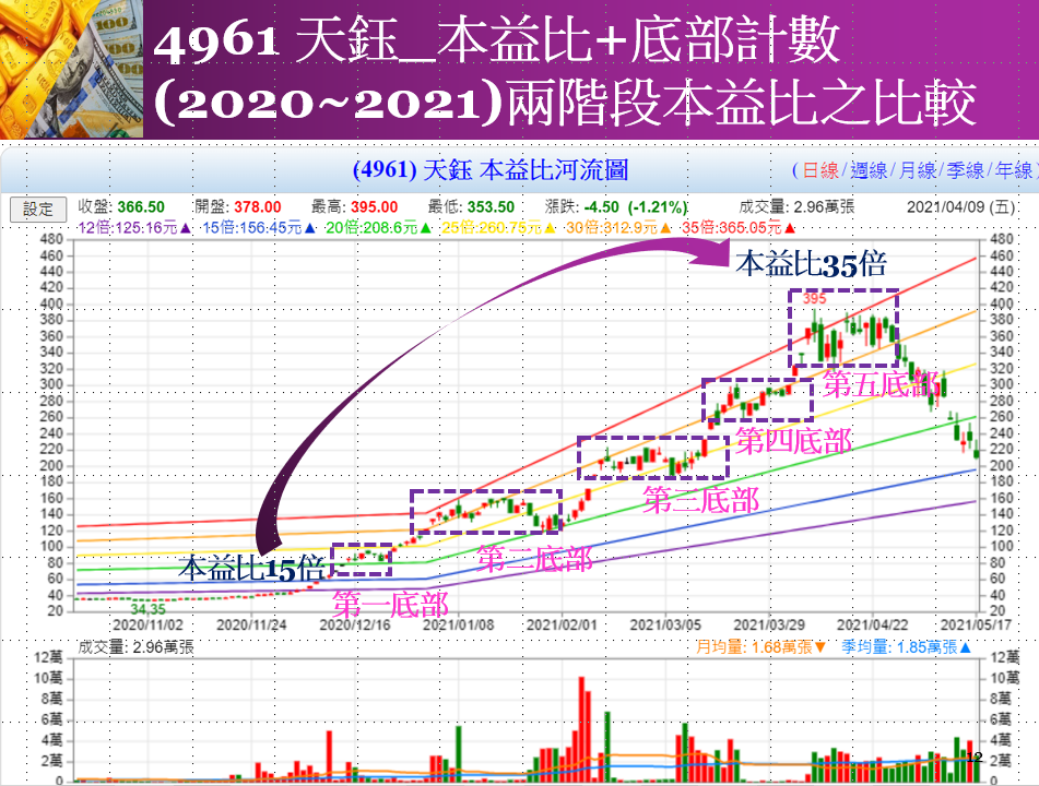 本益比可告訴我們個股是否處於漲勢的末期階段。若持股長達一年期間,且股票已完成二至四個底部,整理完成之後,先前的上升趨勢仍能持續。當上升趨勢發展到最末階段(第四或第五個底部)時,我們可以比較當時與最初進場的本益比,即第一個底部與末期階段的本益比。若本益比已經成長一倍以上(如20X→40X)則須小心應對。