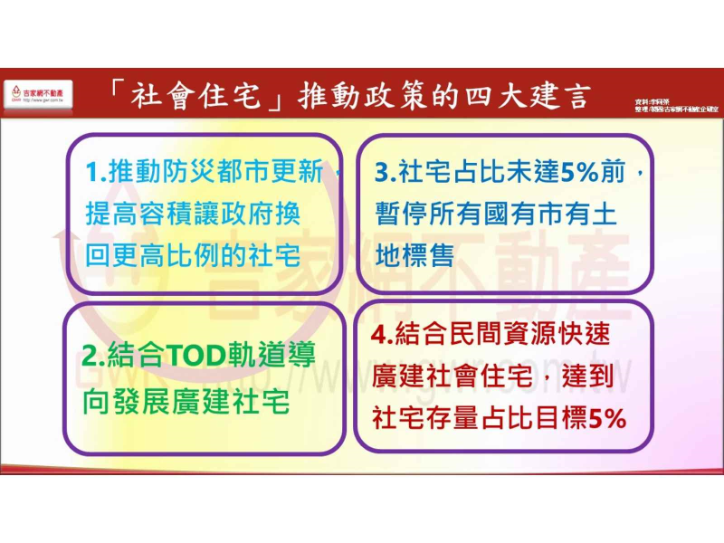 三、結合民間資源快速廣建社會住宅,達到社宅存量占比目標5%:社宅興建政府不應包山包海,應該結合民間氾濫資金,以社宅興建與包租代管,標售給民間企業或保險業,保障一定投資報酬率,並規範合理社宅租金,政府出地,民間出錢興建、出力管理,就能蓋出理想且高品質與優質管理的社宅水平。