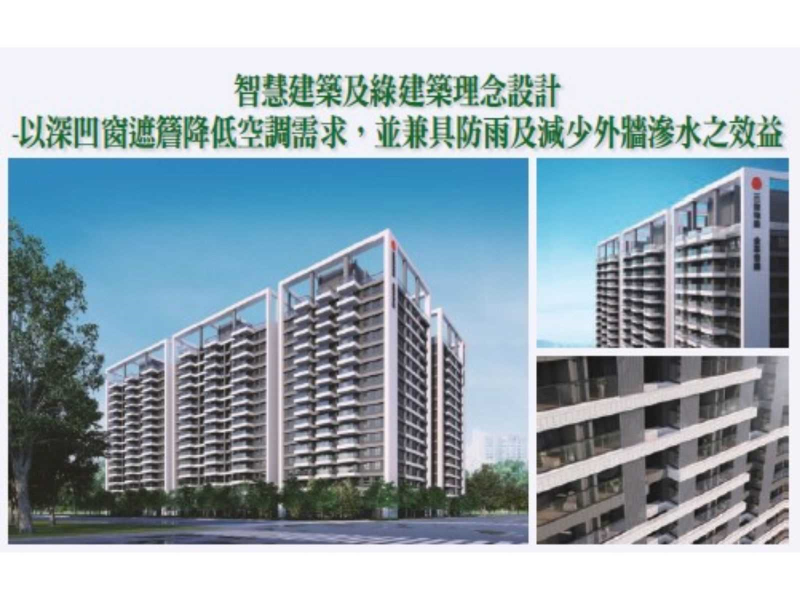 本案以深凹窗遮簷來降低空調的需求,並兼具防雨及減少外牆滲水機會之效益。