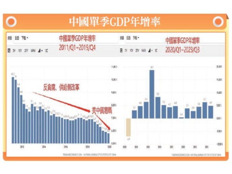 在COVID-19疫情爆發之前,中國每季GDP成長率至少維持在5.8%之上,2019年全年GDP平均值是6%,2020年1.85%,2021年9.18%,因為2021年首季GDP成長率高達18.7%,2022年只有3%,因為動態清零,2023年前三季平均5.23%,關鍵在第三季從6.3%下滑到4.9%,中國的說法是出口衰退,意指境外的需求疲弱,但反過來說,北京官方原先期待的內循環也沒有撐住出口的衰退。